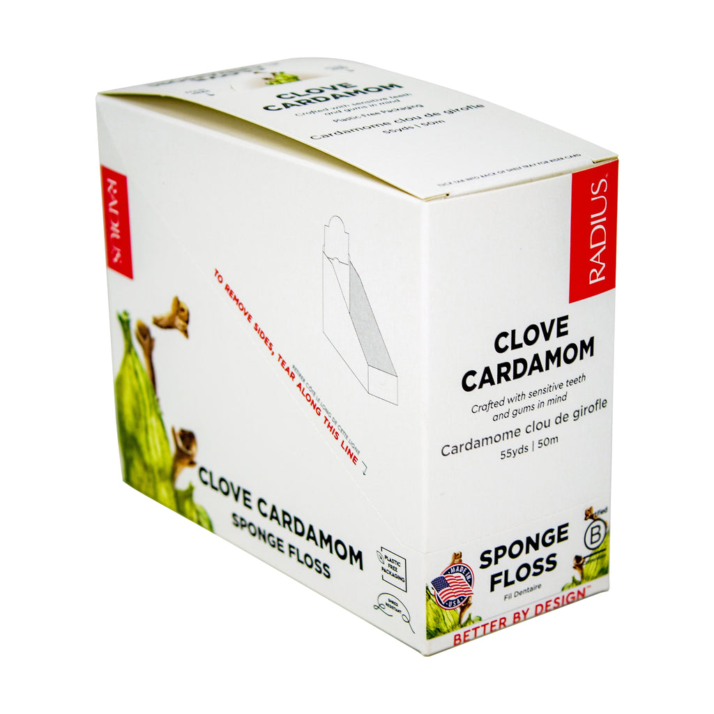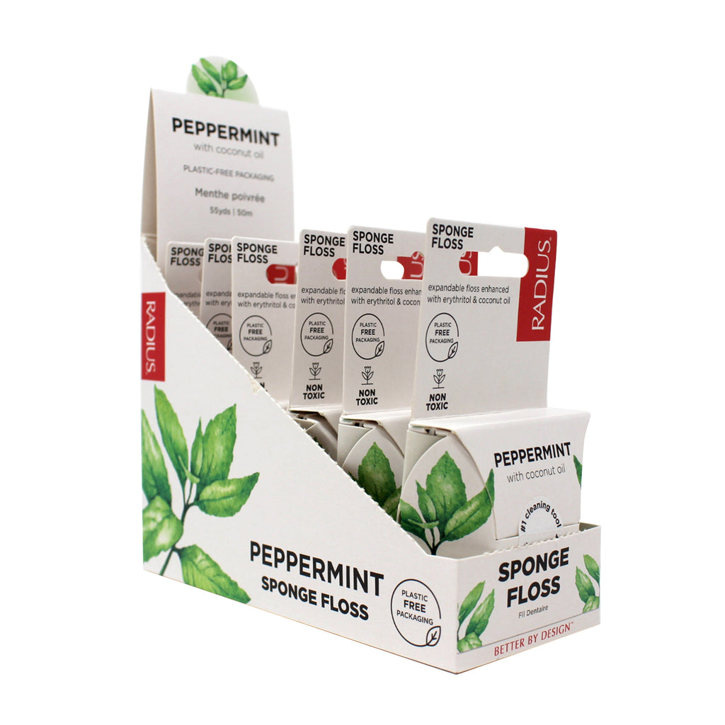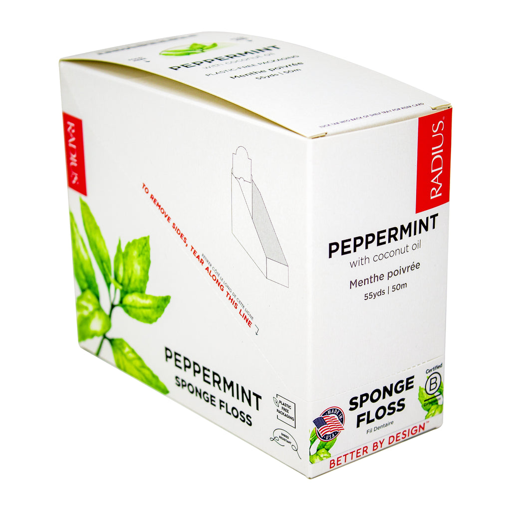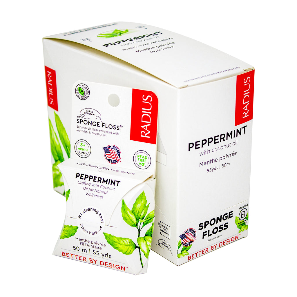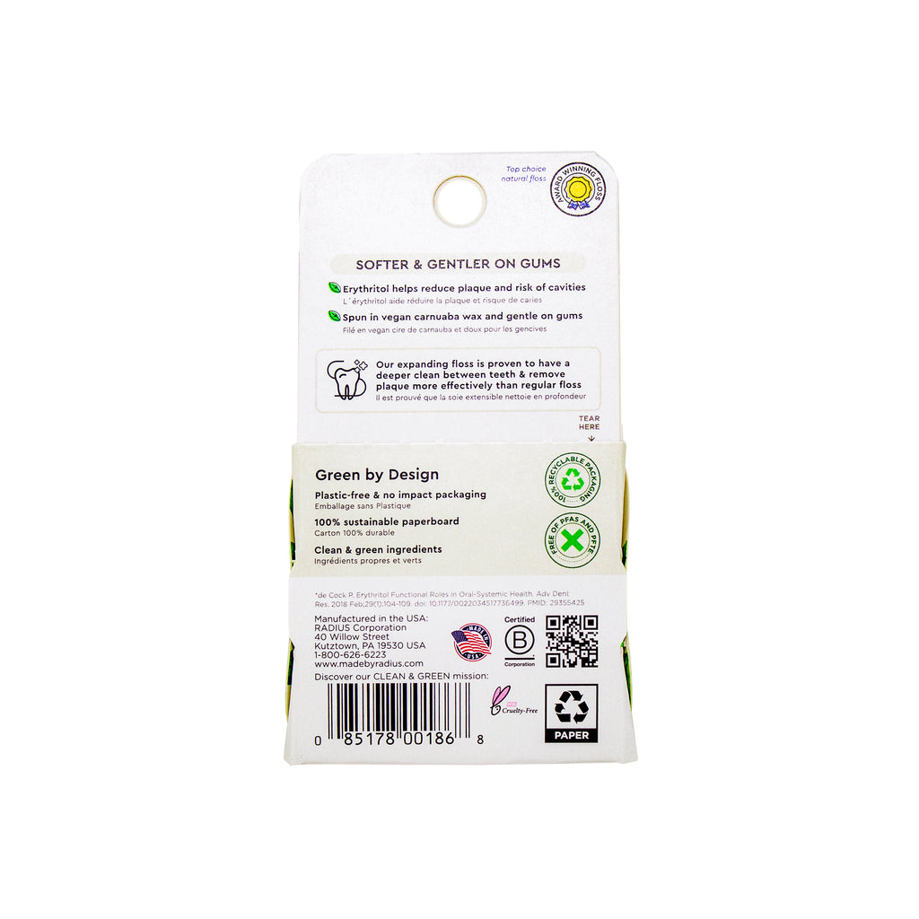 Plastic-free vegan sponge dental floss made with expanding nylon, coconut oil, and erythritol for effective plaque removal and cavity prevention.