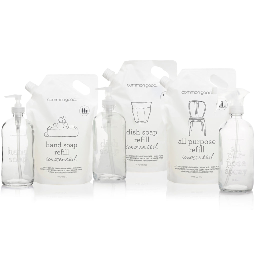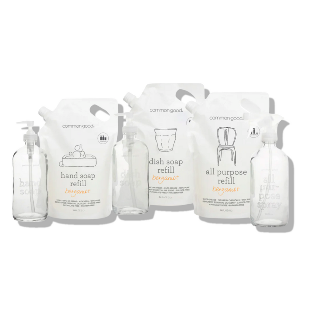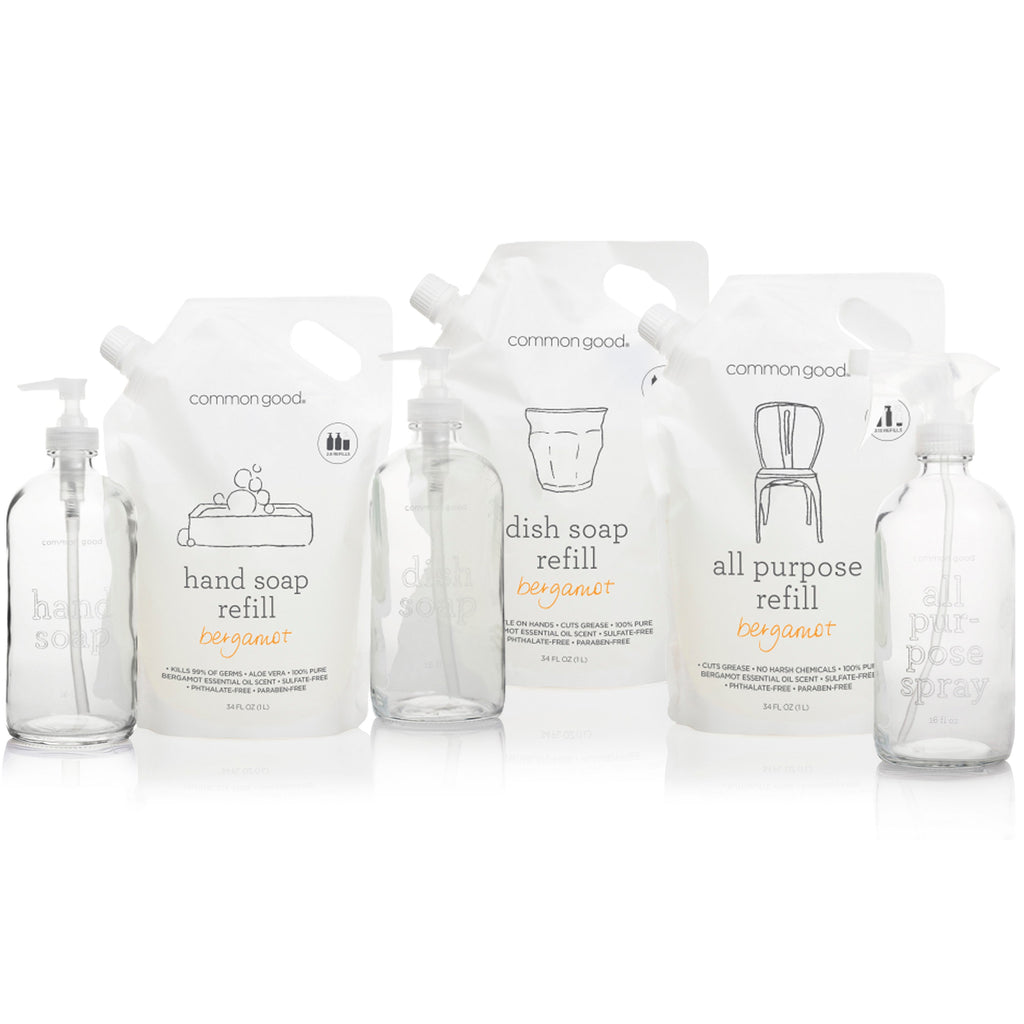 Eco-friendly starter set with refill pouches for All-Purpose, Dish, and Hand Soap plus three reusable glass bottles. Perfect for a low-waste home.