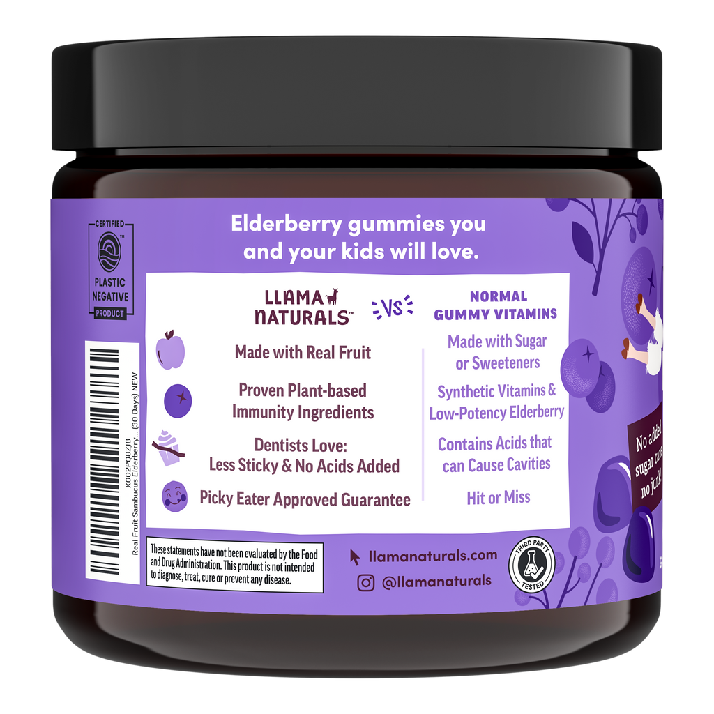 Organic Apple (juice), Organic Peach (puree), Organic European Elderberry Extract (35:1), Organic Vitamin C (Acerola Cherries), Zinc Chelate, Organic Rice Flour (coating), Organic Lemon (juice), Fruit Pectin, Organic Flavor.