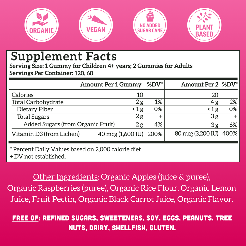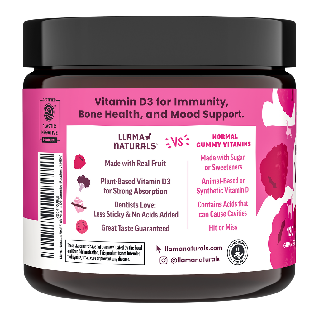 Llama Naturals Vitamin D3 Gummies provide plant-based support for immune health, bone strength, and mood balance. Each gummy is made with organic ingredients and real fruit—free from added cane sugar, artificial sweeteners, and synthetic additives. A clean, effective option for daily wellness, designed to deliver essential vitamin D3 in a form the whole family can enjoy.