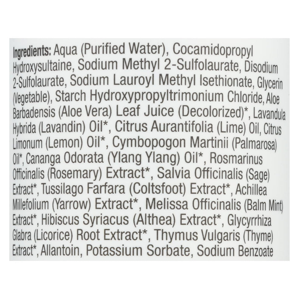Purified Water, Sodium C14‑16 Olefin Sulfonate, Cocamidopropyl Betaine, Aloe Barbadensis (Aloe Vera) Leaf Juice*, Glycerin, Soy Protein, Soyamidopropalkonium Chloride, Lavandula Hybrida (Lavandin) Oil*, Citrus Aurantifolia (Lime) Oil, Citrus Limonum (Lemon) Oil*, Cymbopogon Martinii (Palmarosa) Oil*, Cananga Odorata (Ylang Ylang) Oil*, Helianthus Annuus (Sunflower) Seed Oil*, Simmondsia Chinensis (Jojoba) Seed Oil*, Salvia Officinalis (Sage) Extract, Tussilago Farfara (Coltsfoot) Extract, Achillea Millefolium (Yarrow) Extract, Melissa Officinalis (Balm Mint) Extract, Anthemis Nobilis (Chamomile) Extract*, Rosmarinus Officinalis (Rosemary) Extract, Hibiscus Syriacus (Althea) Extract, Thymus Serpyllum (Wild Thyme) Extract, Equisetum Arvense (Horsetail) Extract, Calendula Officinalis (Calendula) Extract*, Macrocystis Pyrifera (Kelp) Extract, Polyquaternium‑10, Citric Acid, Panthenol, Tocopherol Acetate, Ergocalciferol, Sodium Benzoate, Potassium Sorbate, Ethylhexylglycerin