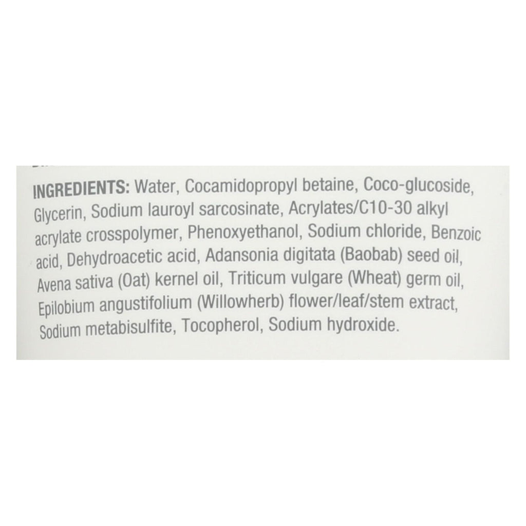 Water (Aqua), Cocamidopropyl Betaine, Coco‑Glucoside, Glycerin, Sodium Lauroyl Sarcosinate, Acrylates/C10‑30 Alkyl Acrylate Crosspolymer, Phenoxyethanol, Sodium Chloride, Benzoic Acid, Dehydroacetic Acid, Adansonia Digitata (Baobab) Seed Oil, Avena Sativa (Oat) Kernel Oil, Triticum Vulgare (Wheat) Germ Oil, Epilobium Angustifolium (Willowherb) Flower/Leaf/Stem Extract, Sodium Metabisulfite, Tocopherol, Sodium Hydroxide