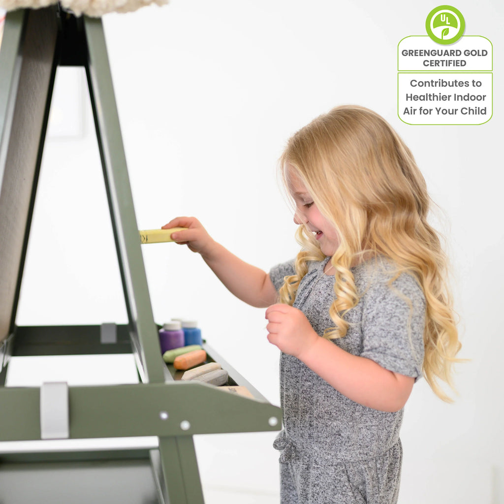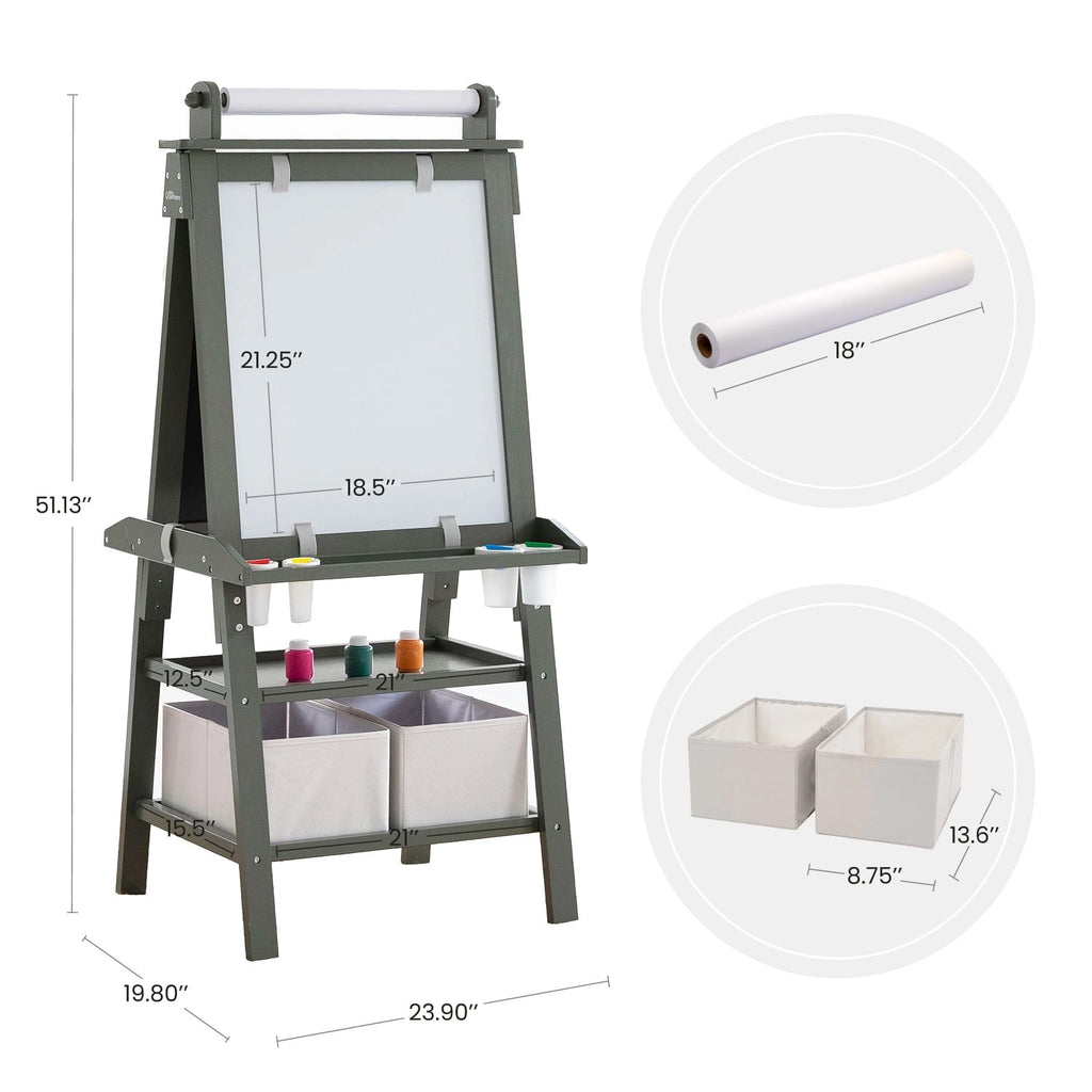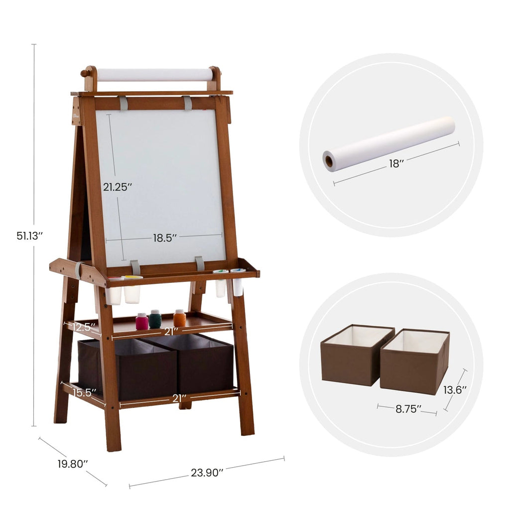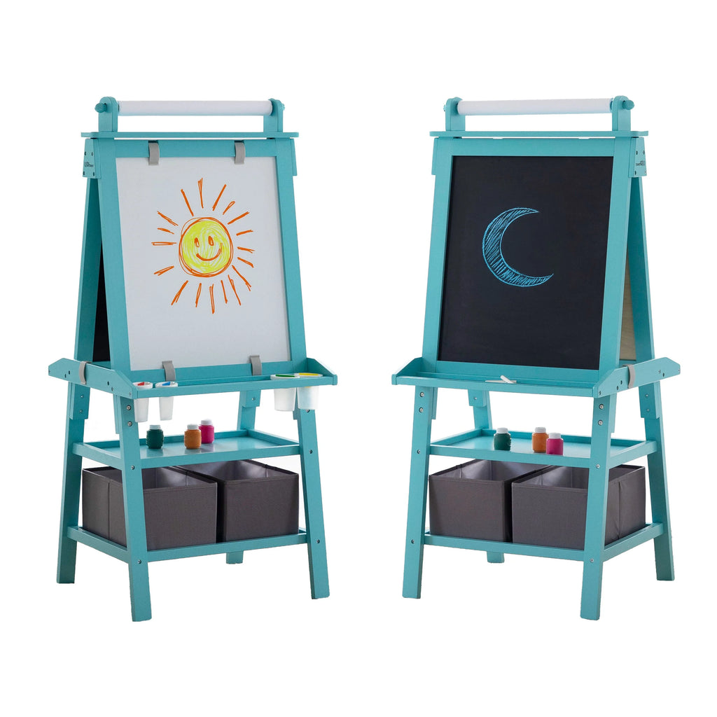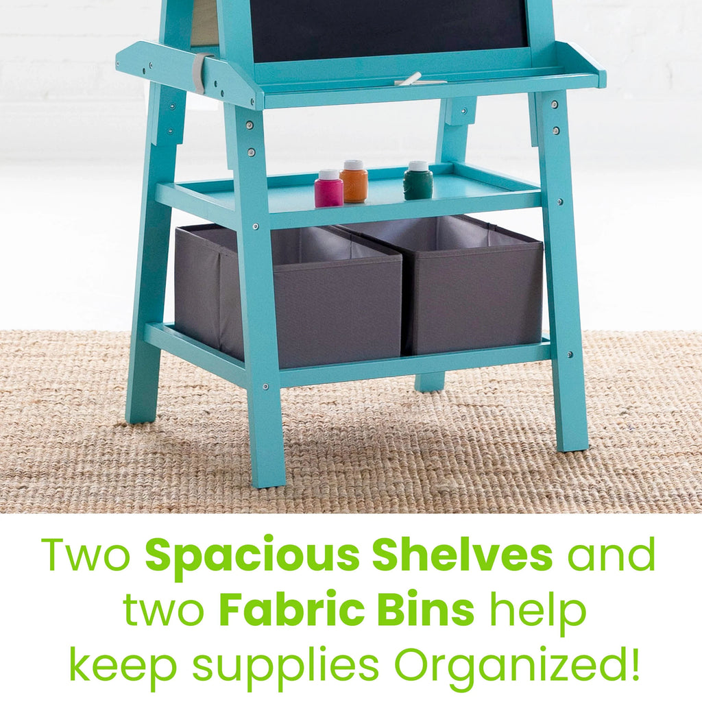 The Deluxe Learn 'N Play Art Center Easel features a chalk board, magnetic dry erase board, and paper feeder, allowing your little one to express the brilliant artist inside. A sturdy A-frame construction made of layered pine will last your little artist through the years. Two wide shelves with two fabric, folding storage bins will keep art supplies easily accessible and organized. Craft paper clips are within easy reach to expand your little one’s options for drawing and painting or giving finished artwork a safe place to dry. One roll of paper, four non-spill paint cups, and an eraser are also included.