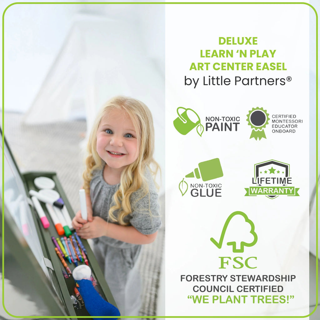 Little Partners® Deluxe Learn 'N Play Art Center is a 3-in-1 art easel with a two-sided design featuring both a chalkboard and magnetic whiteboard ideal for art projects as well as practicing writing skills and number learning