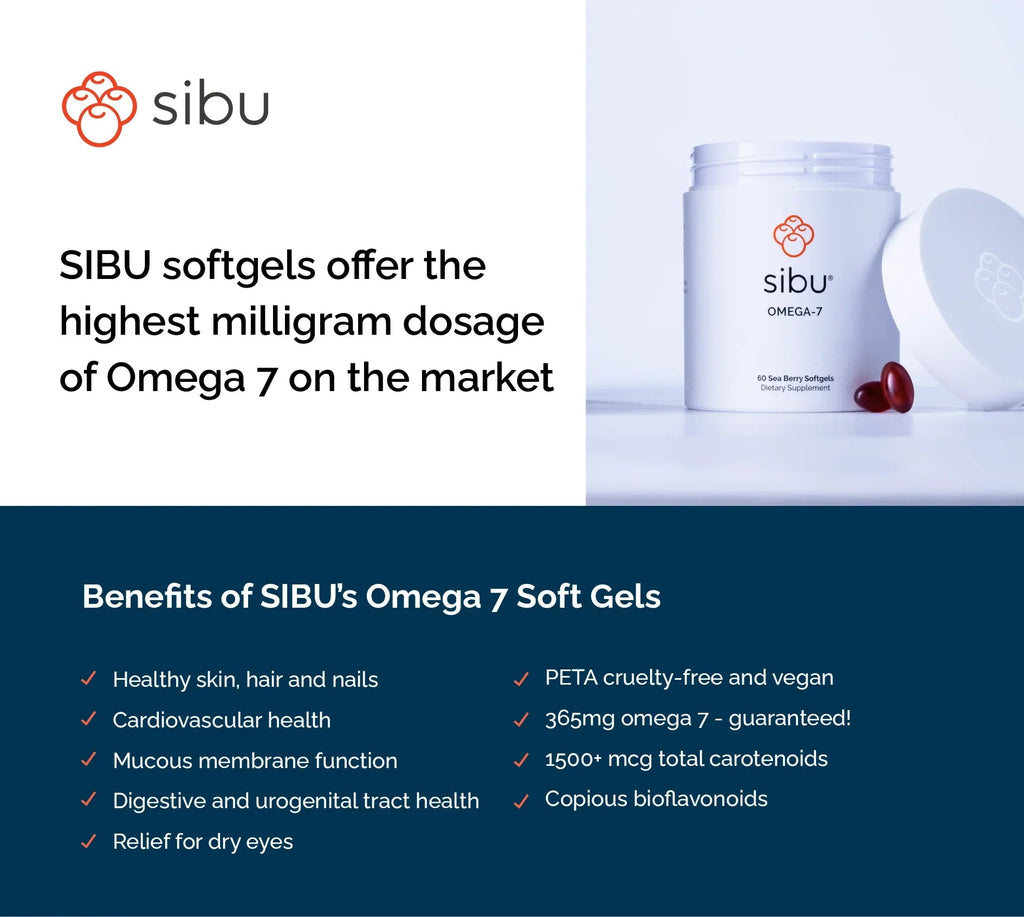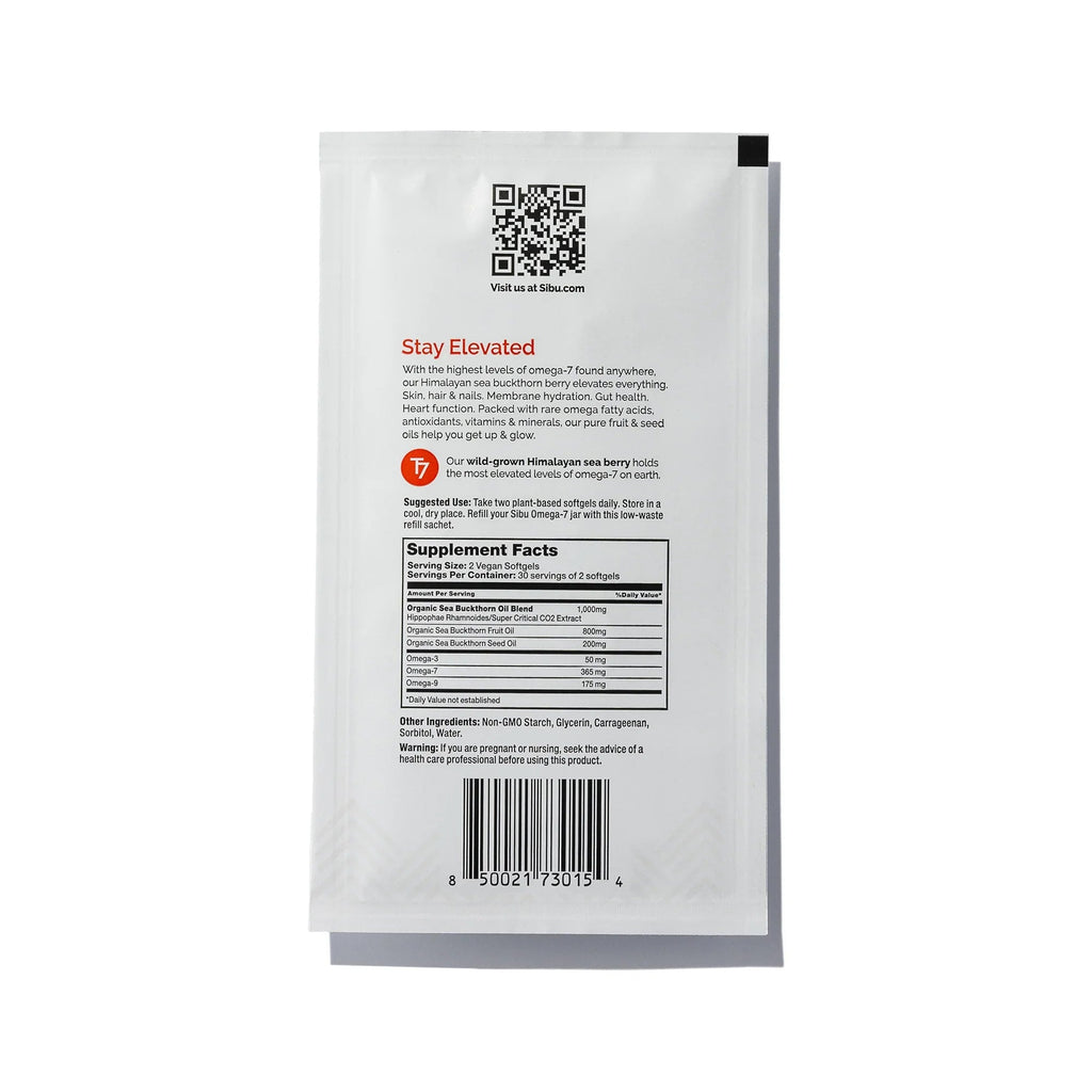 Born in the wild extremes of the Himalayas, sea buckthorn (aka Sea Berry) develops an unmatched inner potency with rare omegas 7-3-6-9, vitamins, minerals, antioxidants, and elevated bioactive compounds. Sibu Omega-7 Plus Softgels are organic — made from Sibu’s rich CO2-extracted seed oil and ripe cold-pressed fruit oil in the exclusive EVOMEGA7™ blend — formulated with care for the body, the environment, and local harvesters.