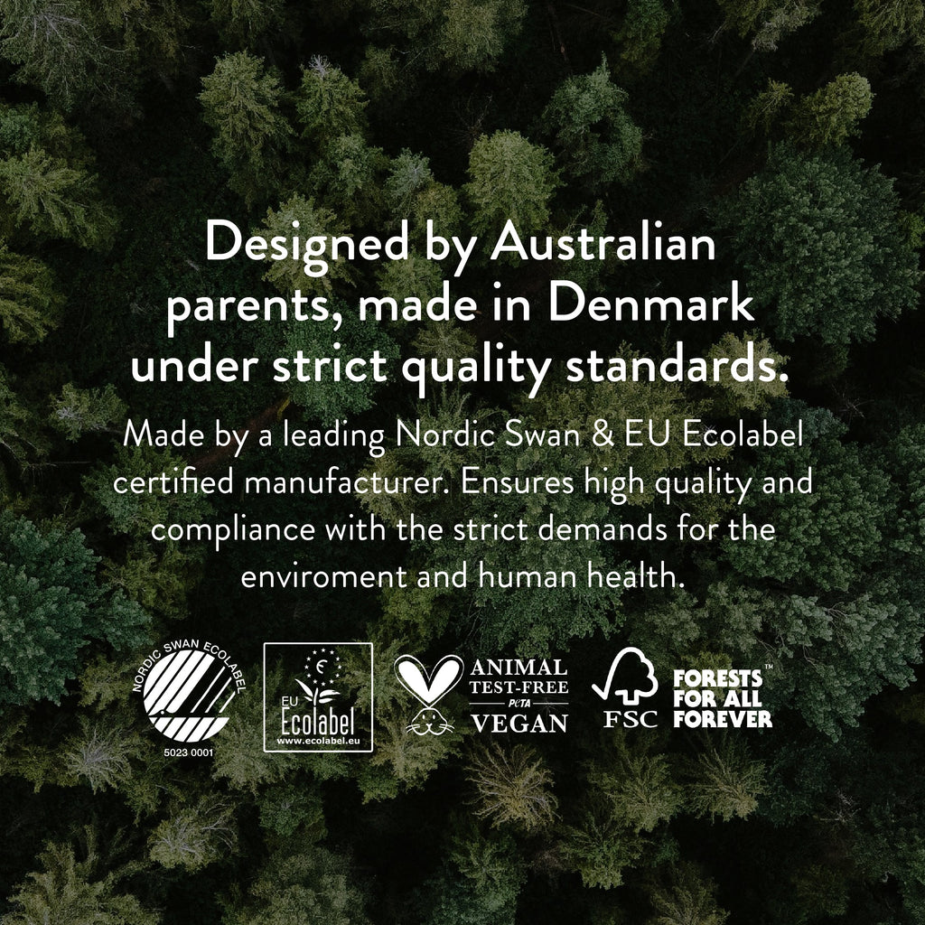 Manufactured in Denmark by a Nordic Swan and EU Ecolabel-certified facility using Totally Chlorine Free (TCF) FSC®-certified pulp from responsibly managed forests. Free from harsh ingredients including fragrances, lotions, phthalates, and parabens. Clinically tested and approved by Dermatest® and Allergy Certified for use on sensitive skin.