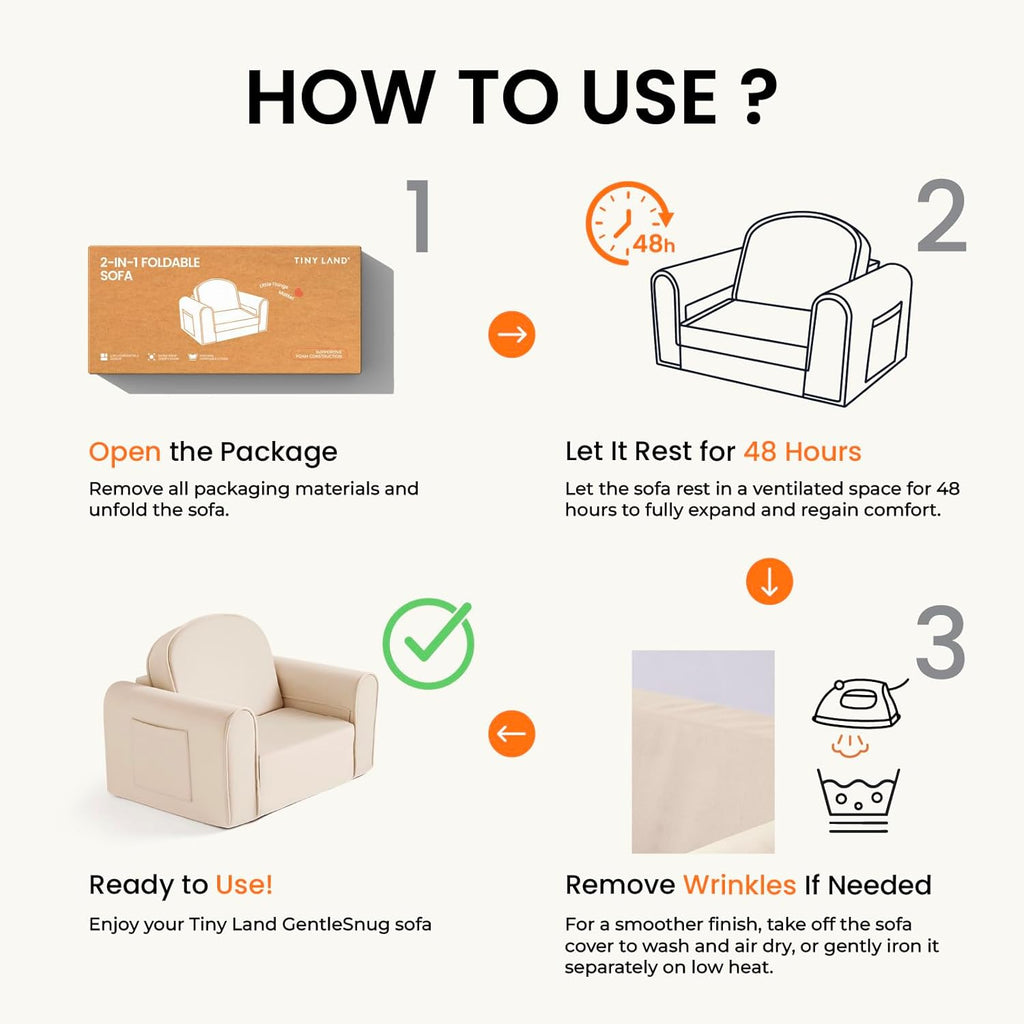 The Tiny Land® 2-in-1 Foldable Sofa is designed to provide children with a comfortable space to sit, lounge, and rest. It easily transforms from a cozy sofa into a soft bed in seconds, making it suitable for storytime, screen time, quiet relaxation, or napping.